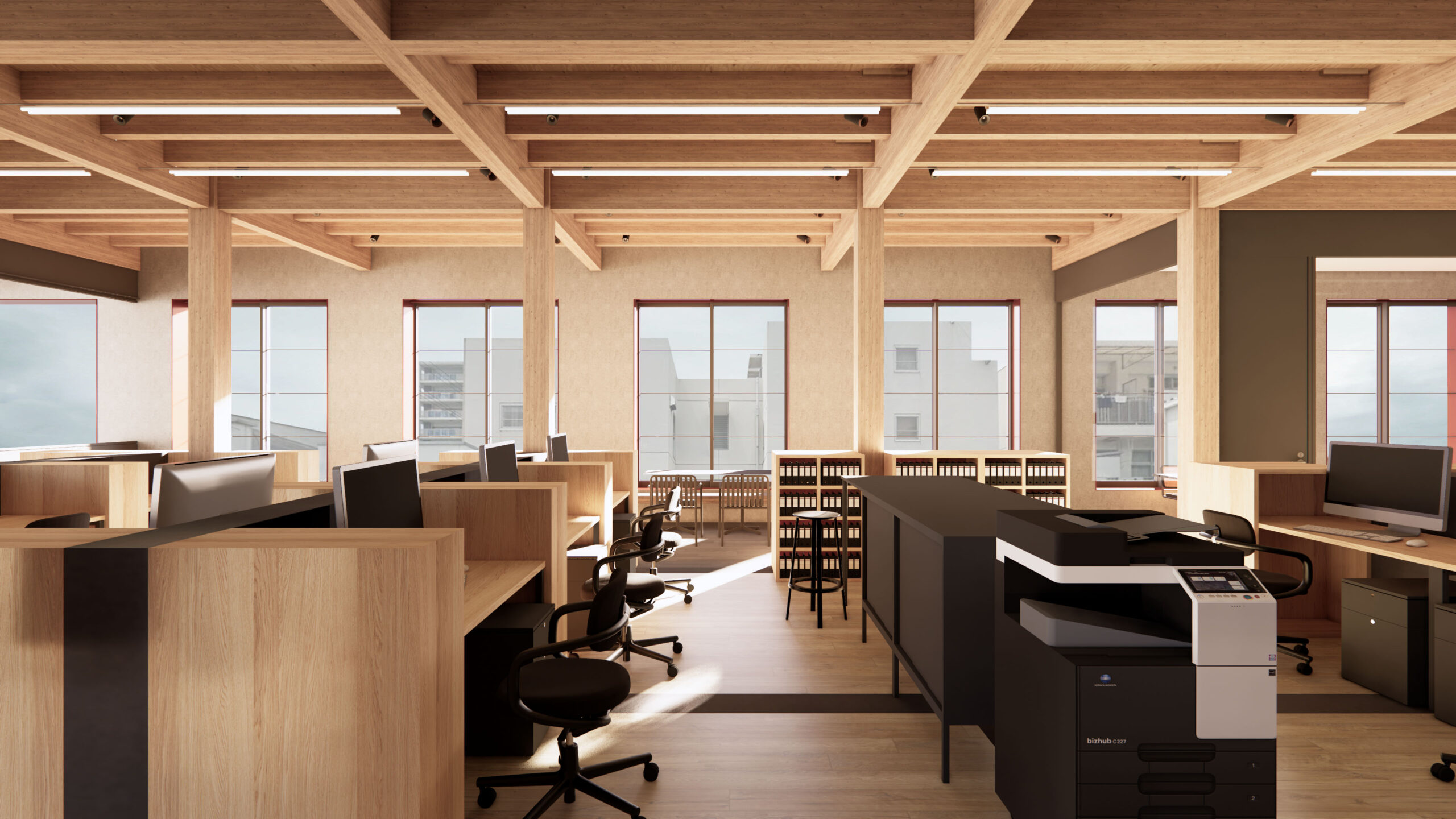 構造躯体には木造ラーメン構造を採用し、3100mmグリッドによるレイアウトと自由度の高い平面計画が、今後の組織の成長に対応するフレキシビリティをもたらす。外壁面に規則正しく並ぶ窓は、明るく、心地よい窓辺のあるオフィス環境をつくり出し、夜にはこれらの窓が街に浮かび上がり、社屋全体が行灯のようなサインとして街に現れる。