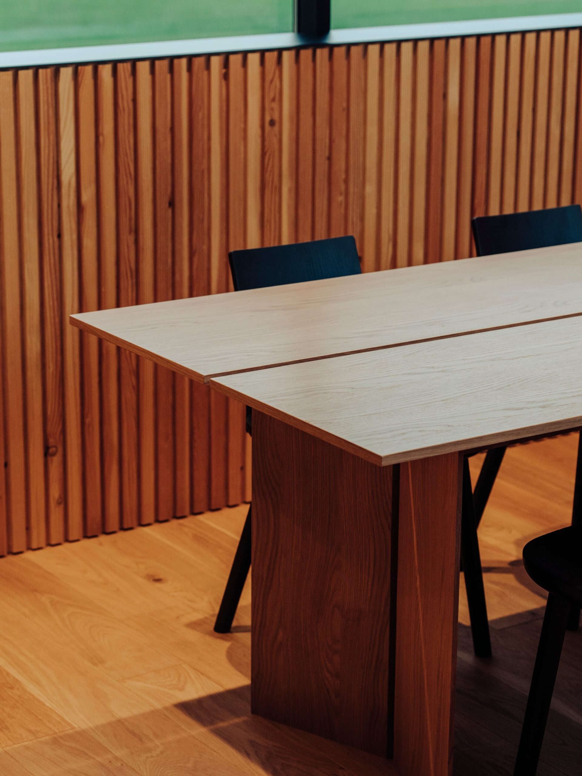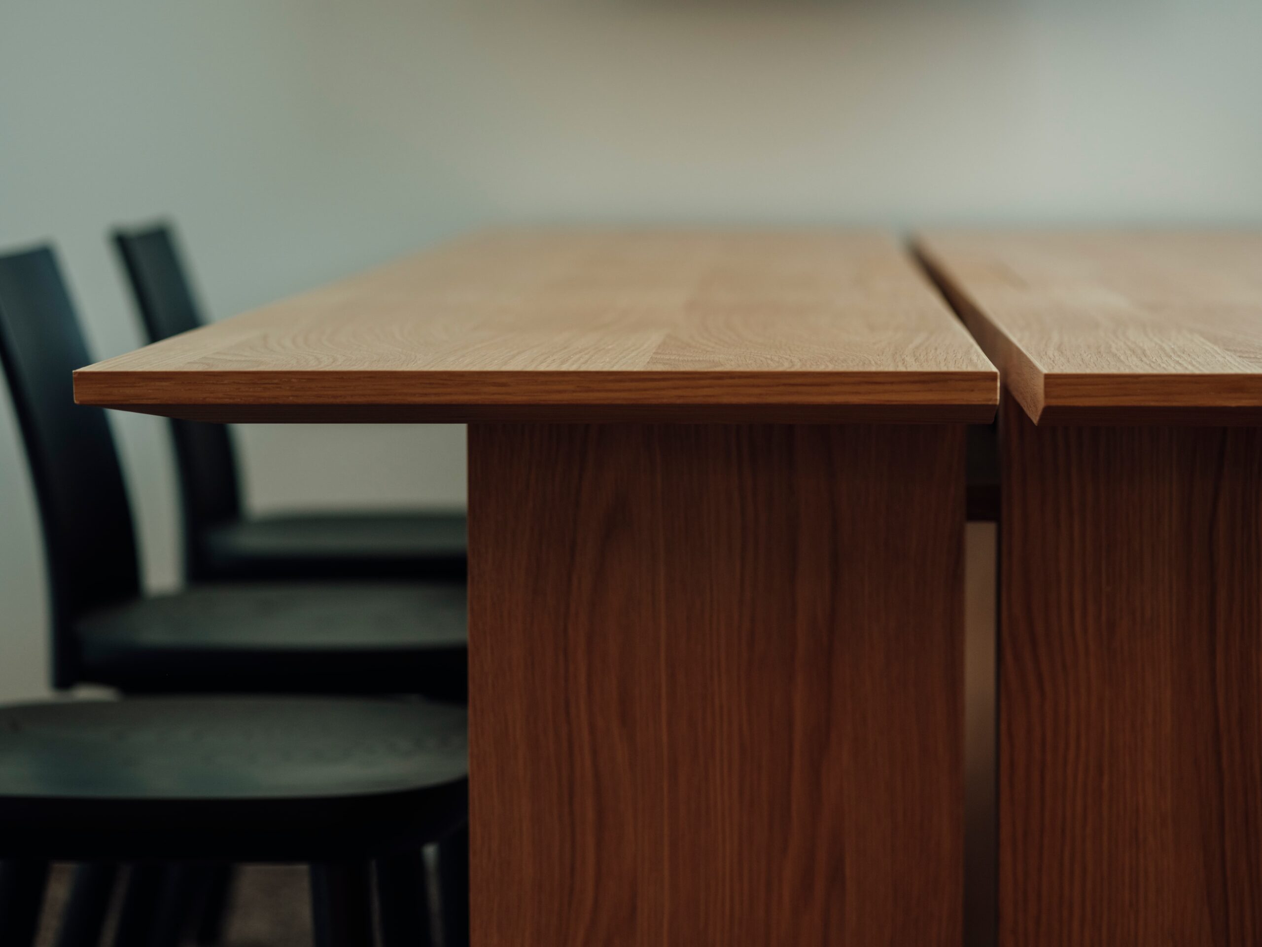 脚部は板状とすることで、視覚的な安定感と空間への馴染みを両立させ、木質空間の中でテーブルそのものが建築の一部のように振る舞うことを意識しています。